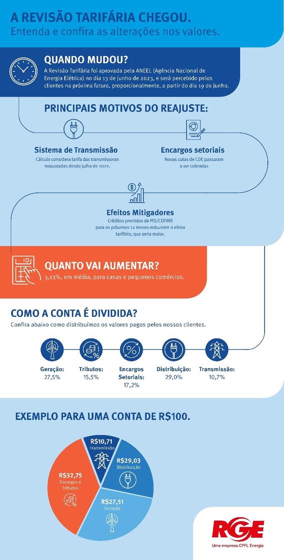 A RGE, distribuidora do Grupo CPFL Energia que atende 381 municípios do Rio Grande do Sul, informa que a Agência Nacional de Energia Elétrica (ANEEL) aprovou no último dia 13 a revisão tarifária periódica (RTP) da concessionária, que entra em vigor a partir de 19 de junho de 2023.