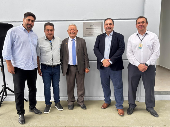 Darwin José de Almeida Rosa, secretário de Serviços Públicos e Obras de Sorocaba; Marcos Amorin, consultor de relacionamento da CPFL Piratininga; Pastor Luis Santos, presidente da Câmara Municipal; Osvanil Pereira, diretor-presidente da CPFL Piratininga; e Jefferson Scudeler, gerente de engenharia da CPFL, durante entrega da SE Sorocaba 8 - Horto (Foto: Divulgação/CPFL Energia)