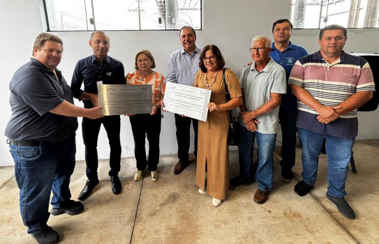 Esq. p/ dir.: Flávio Glaser, diretor; Irma Takeda, da Santa Casa de Misericórdia; Osvanil Oliveira, diretor-presidente da CPFL Santa Cruz; Sarita Pires, presidente do Lar São Vicente de Paulo de Cerqueira César; Clóvis Fragoso, vice-presidente do Lar; Diego Berti Cinto, prefeito de Cerqueira César; e representantes