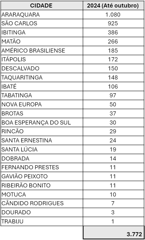 No total, foram regularizadas nesse período 3.772 instalações na região. A cidade com o maior número de casos no período foi Araraquara, com 1.080 unidades. Em segundo está São Carlos, com 925 regularizações, e Ibitinga vem em terceiro, com 386.