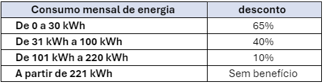 Os descontos da Tarifa Social de Energia Elétrica variam de 10% a 65%, de acordo com a faixa de consumo: