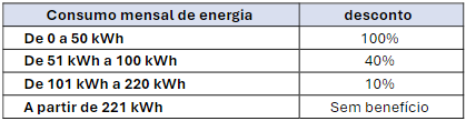 Os descontos da Tarifa Social de Energia Elétrica variam de 10% a 65%, de acordo com a faixa de consumo: