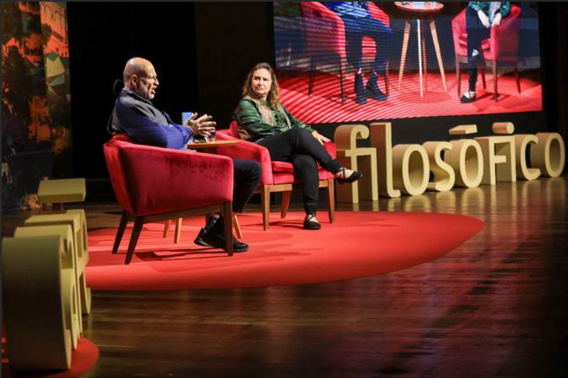 Clóvis de Barros Filho e Lúcia Helena Galvão no palco do Teatro Polytheama (Foto: Divulgação)